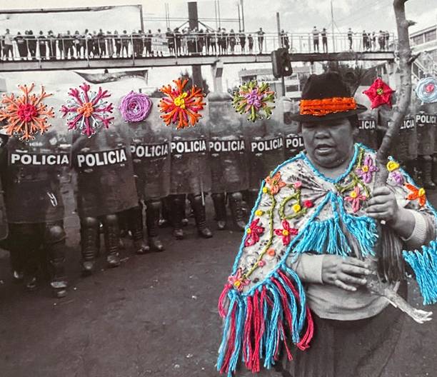 Mientras un pequeño círculo de intelectualoides se rasgaba —y se sigue rasgando— las vestiduras, aleteando alrededor del concepto de «lo andino» en novelas y poemas que para el mundo indígena no significan absolutamente nada (si no, basta con preguntarle, por ejemplo, a Sarawi Andrango, una poeta que también merece ser nombrada), tres manifestantes morían a manos de la represión policial. Qué duro me resulta hoy vivir rodeado por personas a las que apoyo siempre en su lucha, pero cuyo mundo, tal como afirma Reascos, no logro comprender, y aun así lo admiro, lo imagino también. Cuánto desprecio me provoca escuchar que detrás de las manifestaciones y huelgas indígenas supuestamente siempre está la mano titiritera de algún político, de los narcos, de… No importa de quién. La idea es que los pueblos y comunidades indígenas siempre están siendo manipulados por alguien más, es decir, no tienen agencia propia. No quiero repetir ideas que de seguro constan en muchos más artículos. Los fotobordados que acompañan estas líneas se posicionan justamente en ese umbral que nos separa a los blanco-mestizos del mundo indígena. No se parecen a las imágenes distorsionadas de los medios que insisten en perpetuar la idea de inexistentes seres animalescos que pretenden destruir las ciudades. Tampoco muestran a los pueblos y comunidades en entornos bucólicos, pachamámicos, turísticos. Están en pie de lucha. En resistencia constante. Eso quizás sí lo podamos entender. Seguirán luchando, con o sin nosotros, hasta que se los escuche, como ya lo han logrado en varias ocasiones y, ante todo, se los deje de temer y se los empiece a respetar.